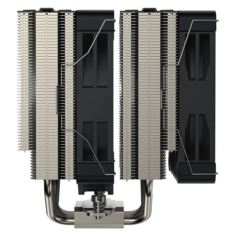 Высокопроизводительный двубашенный кулер с практически бесшумными вентиляторами и шестью тепловыми трубками, плотно запаянными в медное никелированное основание.