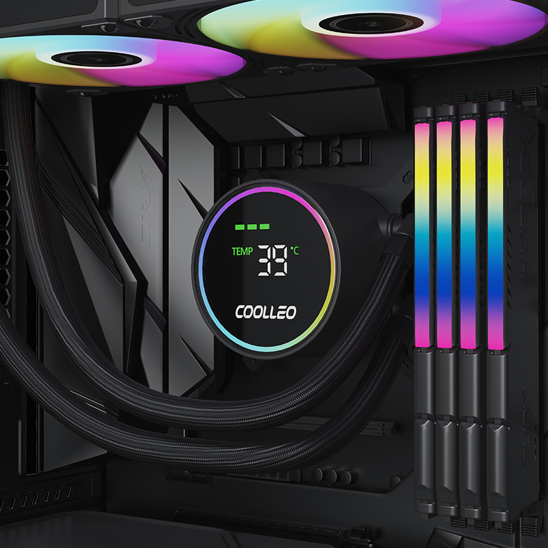 На лицевой части водоблока расположен интеллектуальный цифровой дисплей, который в реальном времени показывает температуру и загрузку CPU, синхронизируясь с Libre Hardware Monitor. При превышении порогов в 60 °C и 80 °C, экран автоматически переключается на жёлтое и красное оповещение, позволяя моментально реагировать на рост температуры. Верхняя крышка выполнена из 2.5D закалённого изогнутого стекла, обрамлена ARGB-подсветкой, синхронизируемой через 5V 3-pin ARGB с остальными элементами системы.