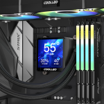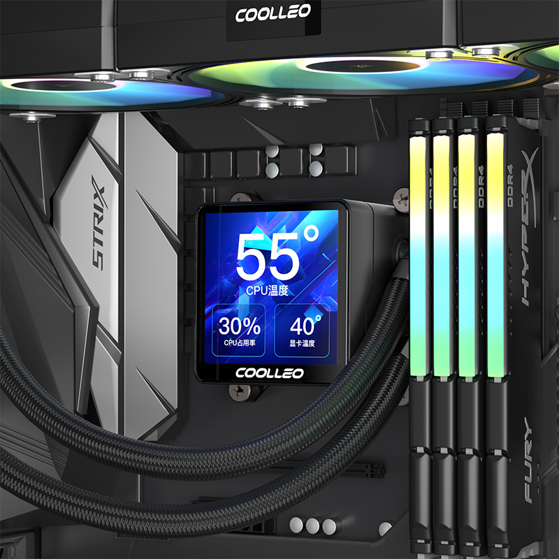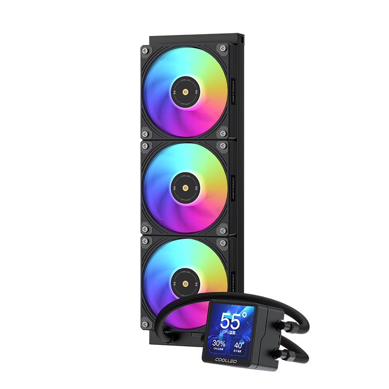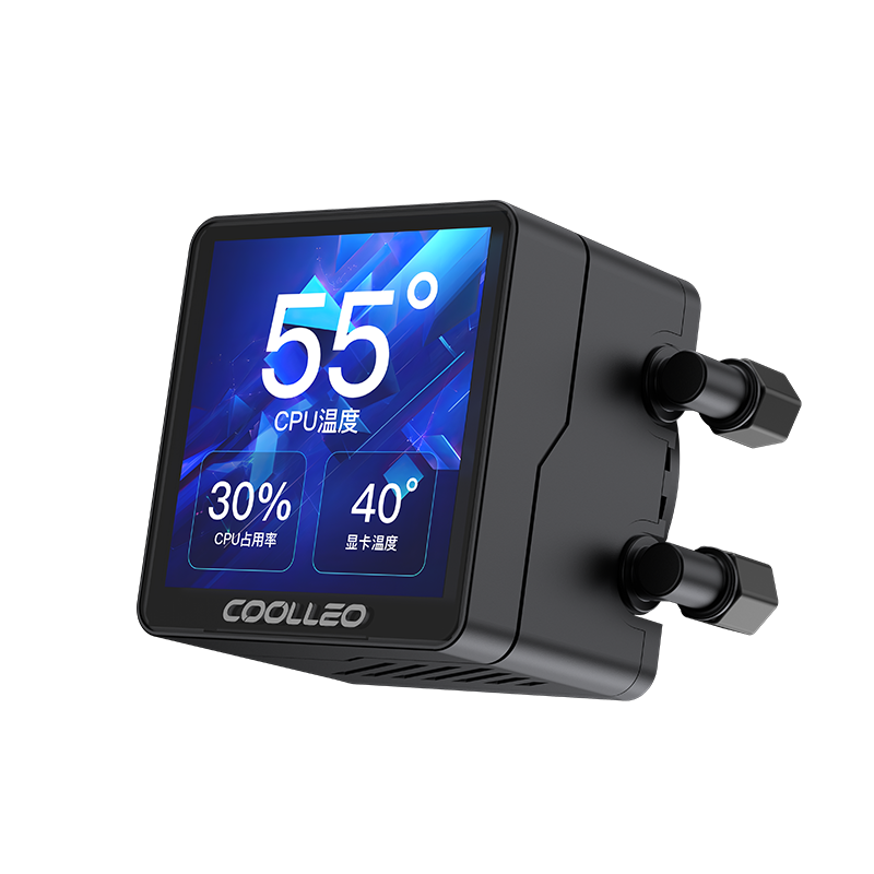 На крышке водоблока установлен 3.4-дюймовый IPS-дисплей с разрешением 480×480 пикселей — это полноценный экран, который может отображать статистику системы, тексты, изображения, GIF и видео. Полная настройка осуществляется через фирменное ПО COOLLEO-Monitor, поддерживается вывод пользовательского контента, включая медиафайлы в форматах MP4, PNG, JPG и даже анимации.