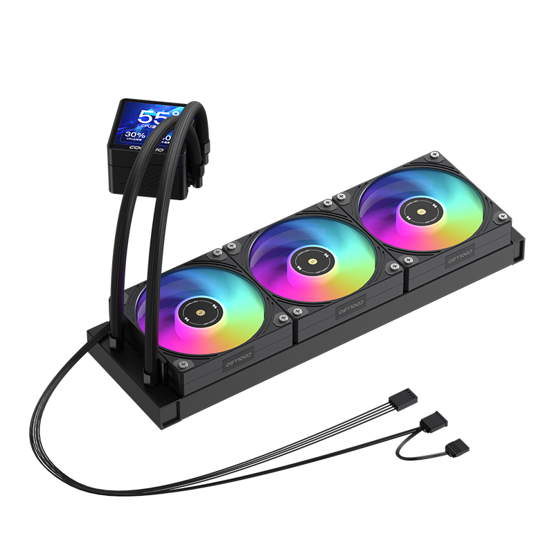 Фронтальная панель водоблока прикрыта 2.5D изогнутым закалённым стеклом, а ARGB-ореол создаёт обволакивающий эффект свечения. Внутри — трёхфазный девятиполюсный мотор с пониженным уровнем вибрации и шумов, способный развивать до 3000 об/мин, при этом оставаясь практически бесшумным (≤28 дБ(A)). Помпа имеет медное основание и рассчитана на 40 000 часов работы, а весь блок работает от стандартного подключения через USB и 4-pin PWM.
