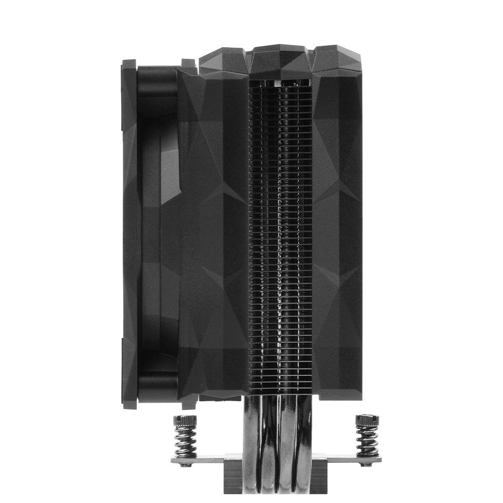 Кулер рассчитан на тепловыделение до 180 Вт, что гарантирует совместимость с современными процессорами и резерв по мощности для будущих обновлений. В конструкции применены четыре тепловые трубки диаметром 6 мм с технологией Direct Touch, а радиатор выполнен из 48 алюминиевых пластин с покрытием c чёрным никелированным покрытием для оптимальной теплопередачи.