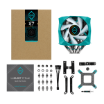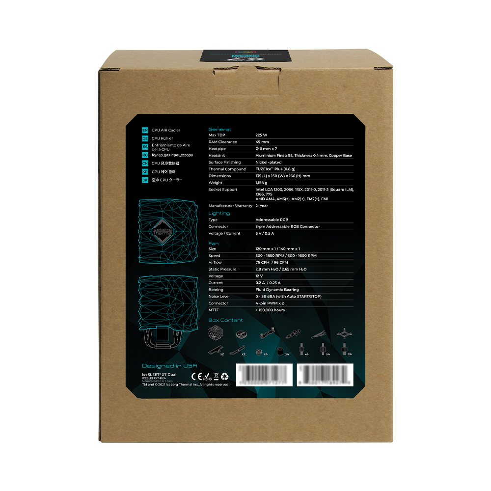 IceSLEET X7 Dual рассчитан на тепловыделение до 225 Вт, что делает его идеальным решением для мощных систем и разгона. Конфигурация с двумя вентиляторами (120 мм и 140 мм) в режиме push-pull обеспечивает интенсивный воздушный поток и статическое давление для максимального охлаждения. Скорость вращения регулируется в диапазоне от 500 до 1850 об/мин (120 мм) и от 500 до 1600 об/мин (140 мм), а технология Auto START/STOP позволяет снизить шум и энергопотребление при низкой нагрузке. Уровень шума составляет от 0 до 38 дБА при воздушном потоке до 96 CFM.