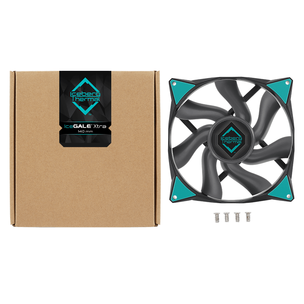 Размер вентилятора составляет 140×140×25 мм, подключение осуществляется через 4-pin PWM. Рабочее напряжение – 12 В, потребляемый ток – 0,56 А, уровень шума в диапазоне от 0 до 47 дБА. В комплект входит вентилятор IceGALE® Xtra 140 mm и четыре винта для крепления.